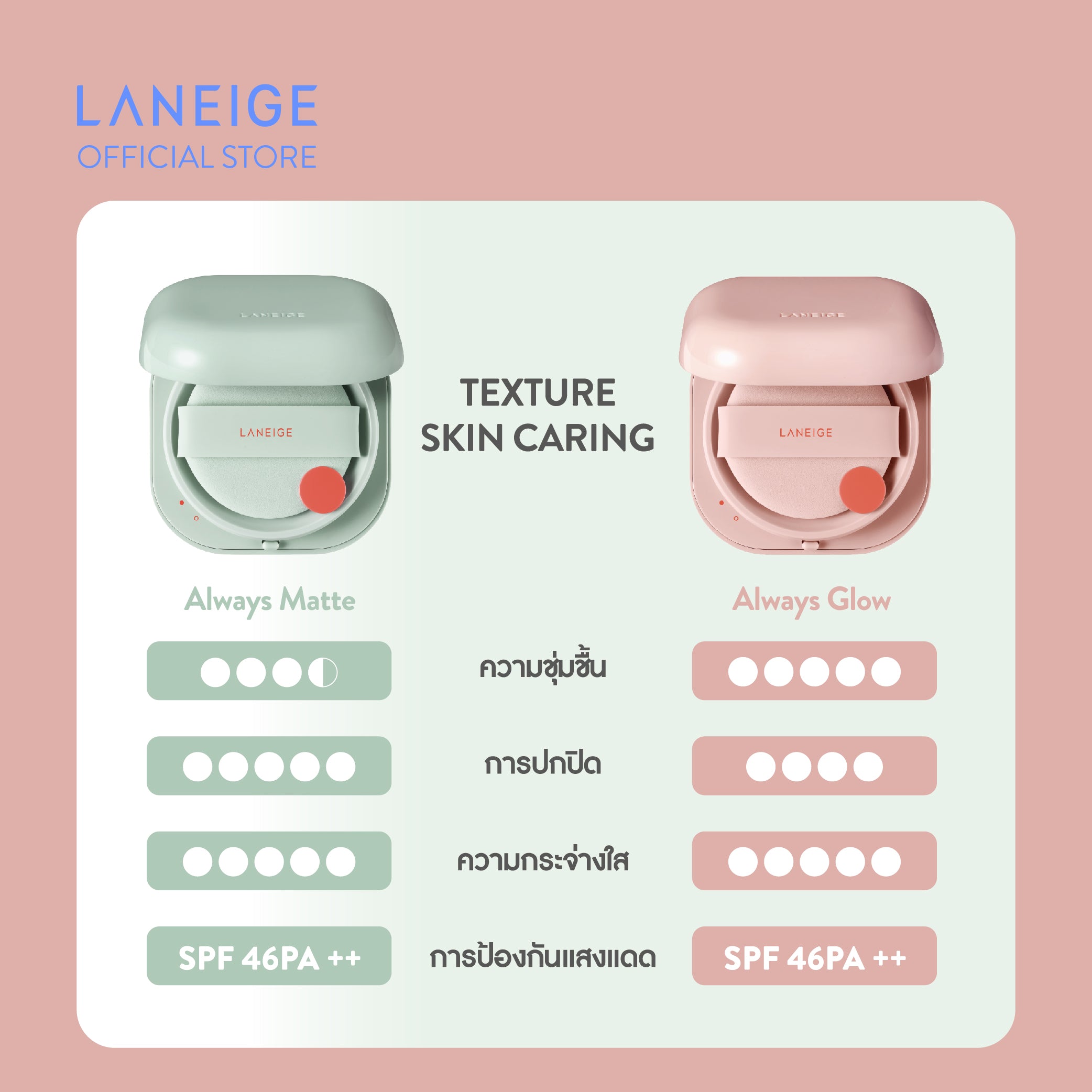 | ผลลัพธ์บนผิว | ผิวแมตต์ตลอดวัน | ผิวโกลว์ชุ่มชื้น |
